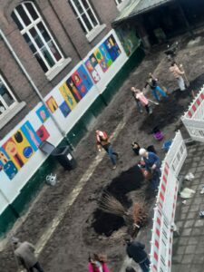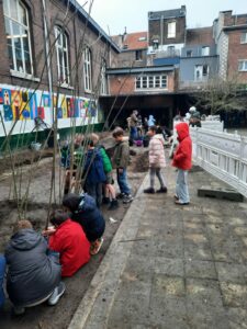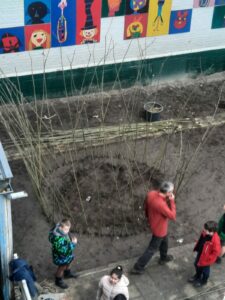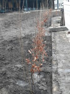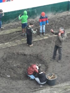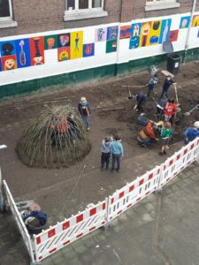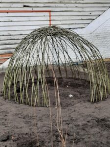 Il démarre fort avec la construction d’une cabane en saule, la plantation de haies et la préparation de nos futurs parterres …